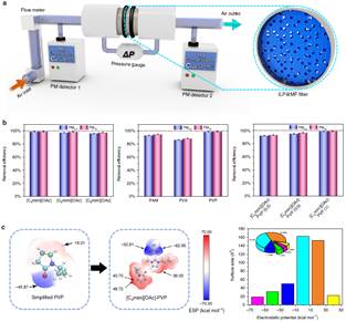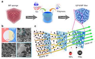 该团队结合了拥有良好电化学特性的功能材料——离子液体1-甲基-3-丁基咪唑鎓乙酸盐([C4mim][OAc])以及具有良好可塑性的高分子,制备了可无规则分布在多孔泡沫骨架上的导电高分子复合材料(ILP)。这种巧妙的设计既实现了材料与污染物的充分接触,又降低了过滤设备前后的压降。最终通过添加3 V的安全电压,实现了对PM2.5、PM10以及NP的高效去除,效率达99.59%、99.75%以及93.77%。