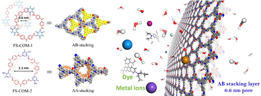 图1. COF膜堆积方式及离子/分子筛分示意图