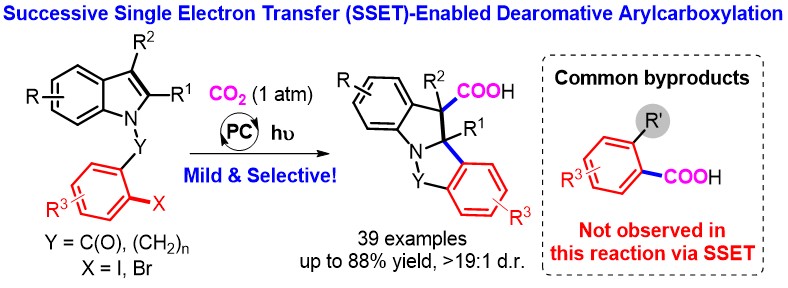 余达刚教授课题组一直致力于绿色有机合成化学研究,主要集中于二氧化碳(CO2)资源化利用和可见光催化,发展了可见光促进的CO2高效转化新策略和新方法(ACIE 2017, 56, 15416; OL 2017, 20, 190; ACIE 2018, 57, 13897; JACS 2018, 140, 17338; OL 2018, 20, 3049; Nat. Commun. 2019, 10, 3592)。针对CO2参与多组分还原偶联反应中存在的挑战,不同于以往过渡金属催化的双电子氧化加成过程,余达刚教授团队利用“连续单电子转移(successive single-electron transfer, SSET)”策略,基于“自由基-碳负离子”反应历程,成功实现了第一例可见光促进CO2参与的吲哚类化合物的还原去芳构化-羧基化反应。在该工作中,余达刚教授团队在无过渡金属、较低的光催化剂用量以及一个大气压CO2 的温和条件下高选择性地实现了吲哚类化合物的还原去芳构化反应,为合成重要的吲哚-3-羧酸类化合物提供了新方法。机理研究证明苄基自由基及苄基负离子可能是反应的关键中间体。