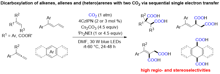 该研究成果于2021年4月15日在Nature Catalysis期刊在线发表,题目为“Dicarboxylation of alkenes, allenes, and (hetero)arenes with CO2 via visible-light photoredox catalysis” (文章链接://www.nature.com/articles/s41929-021-00594-1)。四川大学2019届博士鞠涛为论文第一作者,通讯作者为余达刚教授,四川大学为本文第一单位。特别感谢国家自然科学基金委、霍英东基金会、四川省科技厅、四川大学和北京分子科学中心的经费支持。
