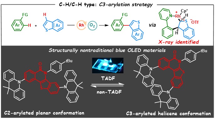 图2. 苯并噻吩C3位选择性芳基化反应及OLED材料设计思路