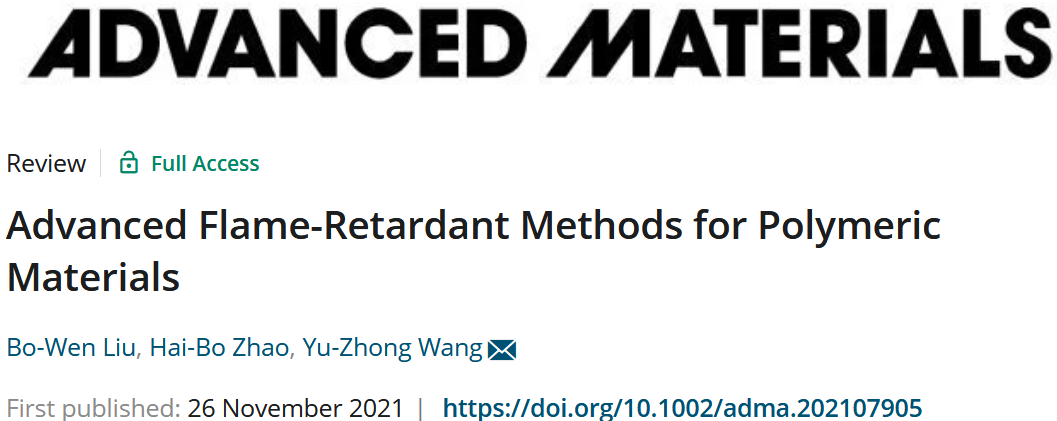 该文以“Advanced Flame-Retardant Methods for Polymeric Materials”为题发表在《Advanced Materials》上。共同第一作者为四川大学省部共建环境与火安全高分子材料协同创新中心刘博文研究员和赵海波教授,通讯作者为王玉忠教授。本文报道的作者相关研究工作先后得到国家自然科学基金重大项目、重点项目、面上和青年项目以及人才基金等不同类项目的资助。