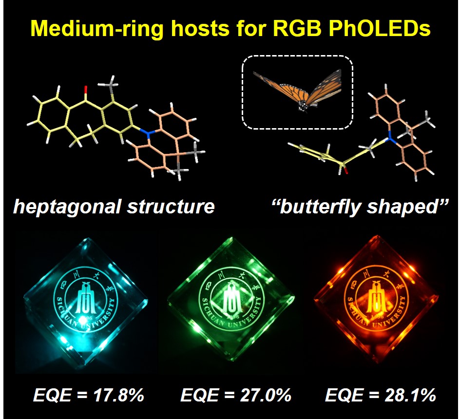 该研究以“Structurally Nontraditional Bipolar Hosts for RGB Phosphorescent OLEDs: Boosted by a “Butterfly-Shaped” Medium-Ring Acceptor”为题目发表在Angewandte Chemie International Edition上,四川大学为第一单位,体育网足球即时比分