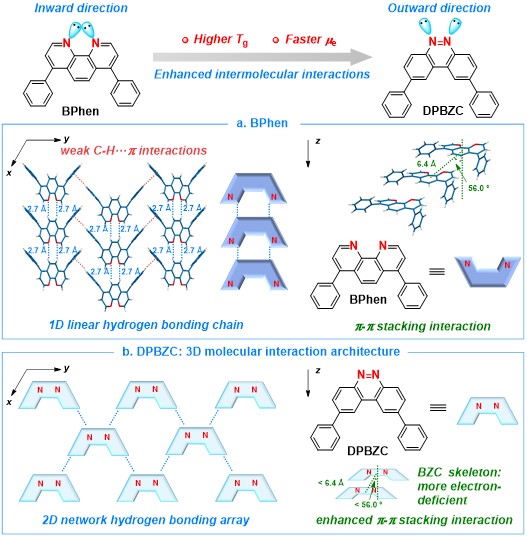 四川大学游劲松教授、宾正杨副研究员团队通过对广泛使用的电子传输材料4,7-二苯基-1,10-邻菲啰啉(BPhen)的单晶结构进行深入分析,揭示了其存在较弱的分子间C−H×××p相互作用,可能促使分子滑动而产生聚集现象,最终导致材料较低的Tg值(62 ℃)。据此,课题组提出了“三维分子相互作用”策略来改善材料的Tg值。作者将1,10-邻菲啰啉骨架中的分散的两个氮原子聚集,一方面增强其缺电性,降低最低未占据轨道能级,有利于提高电子的注入效率;另一方面,两个氮原子的孤对电子由向内转变为向外朝向,有利于增强分子间氢键相互作用。因此,作者设计了一类非传统的苯并噌啉结构,并以铑催化的氧化C−H/C−H自偶联反应为关键步骤,成功构筑了以苯并噌啉为母核的新型电子传输材料2,9-二苯基苯并噌啉(DPBZC)。单晶结构显示其存在高度有序的三维分子相互作用,包含二维网状氢键相互作用和一维p-p相互作用。在x-和y-轴方向,DPBZC的氢键长度略短于BPhen的氢键长度,因此DPBZC拥有比BPhen更强的分子间氢键相互作用;在z-轴方向,DPBZC展现出面对面的堆积模式,拥有比BPhen更强的分子间p-p相互作用。因此,高度有序的三维分子相互作用赋予了DPBZC极高的Tg值,其达到218 ℃,远高于BPhen等常用电子传输材料,并且也赋予了其较高的μe值,达到6.4 ´ 10-4 cm2/V s。