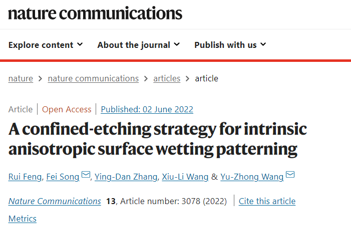 王玉忠院士和宋飞教授在Nature Communications上发表题为“A Confined-Etching Strategy for Intrinsic Anisotropic Surface Wetting Patterning”的研究论文(Nat. Commun. 2022, 13, 3078)。四川大学为论文唯一署名单位,体育网足球即时比分