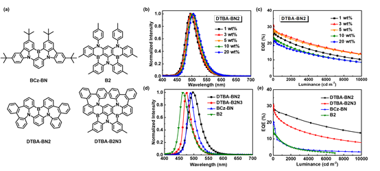 OLED测试结果表明,相比于基于BCz-BN的OLED,基于DTBA-BN2的OLED展现出了明显更加优异的器件性能以及更好的ACQ抑制作用,实现了31.2%的最大外量子效率、更小的效率滚降(EQE1000 = 25.6%)。此外,中环结构的引入可以有效保护发光中心,抑制分子聚集产生的光谱展宽和发光淬灭,使得在1~20%的浓度窗口下保持高效率和窄光谱。相比于基于对比分子B2的OLED,基于DTBA-B2N3的OLED展现出了明显更加优异的器件性能以及更窄的半峰宽,实现了30.9%的最大外量子效率、更小的效率滚降(EQE1000 = 20.5%)。这项工作为开发可产业化的高性能MR-TADF分子提供了一个新的分子设计思路。