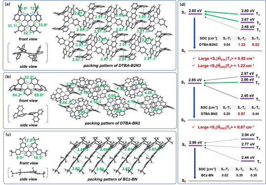 在MR-TADF材料BCz-BN的基础上,基于“中环”策略发展了新型MR-TADF分子DTBA-BN2和DTBA-B2N3。理论计算研究表明,通过引入七元环受体基团,DTBA-BN2的S1态跃迁特征与其T2态的跃迁特征有较大的差异,因此具有更高的自旋轨道耦合系数(SOCS1-T2 = 0.87 cm-1),有利于其反系间窜越过程。随后,进一步拓展共振骨架,双硼类MR-TADF分子DTBA-B2N3的自旋轨道耦合系数得到进一步提高(SOCS1-T2 = 1.22 cm-1,SOCS1-T3 = 0.82 cm-1),使得激子从T2或T3态的反系间窜越过程更加高效,最终将kRISC从BCz-BN的104 s-1提升到DTBA-B2N3的106 s-1数量级。此外,BCz-BN的核心发光骨架较为平面,具有强烈的分子间π-π相互作用,ACQ效应十分严重。通过引入七元环受体,MR-TADF分子DTBA-BN2和DTBA-B2N3具有高度扭曲的分子构型,其核心骨架不存在明显的π-π相互作用,极大程度上抑制了ACQ效应,有利于改善器件效率滚降。