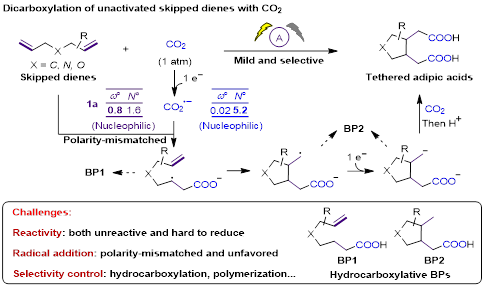 二氧化碳(CO2)既是人们熟知的温室气体,也是一种重要的碳资源,具有储量丰富、无毒且可循环再生等优点。利用廉价易得的烯烃与CO2发生羧基化反应,高效合成具有高附加值的羧酸化合物,是实现CO2高值化利用的重要途径。其中,CO2参与的烯烃双羧基化反应能够合成在高分子材料与生物医药等领域具有广泛用途的二酸单体,具有重要研究价值。然而,目前CO2参与的烯烃双羧基化反应的底物主要局限于活化烯烃,如苯乙烯、丙烯酸酯、联烯和1,3-二烯类等。相比而言,非活化非共轭二烯虽然广泛存在且容易制备,但由于活性低,难以和CO2反应生成高附加值的二酸产物。因此,开发新策略实现CO2参与的非活化非共轭二烯双羧基化反应,具有重要意义。