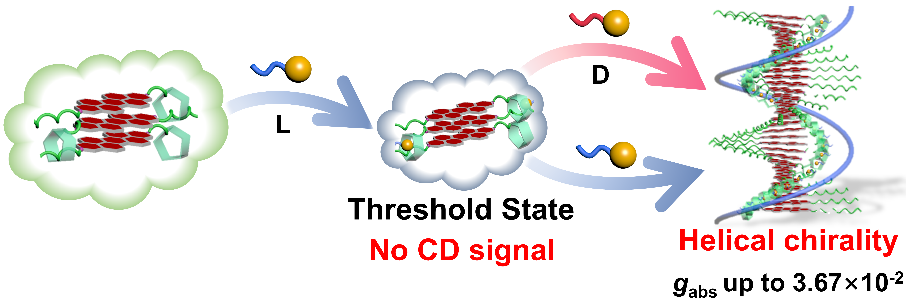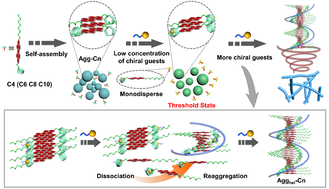近日,四川大学的杨成教授团队,以柱[5]芳烃衍生化的苝二酰亚胺组装体为研究对象,以氨基酸衍生物为手性诱导客体,通过主客体作用,构建了中心-平面-螺旋手性的多级手性放大体系,并观察到了阈值效应和罕见的“先到先得”效应,在重组装过程中通过热动力学效应维持住了较高能量聚集体。该氨基酸诱导的重组装过程实现的多级手性放大,使得苝二酰亚胺吸收带的圆二色gabs高达3.67×10-2。动力学实验表明Agghel-Cn手性信号产生符合协同组装机制,即超过阈值浓度Agg-Cn逐渐发生解离-再聚集过程,形成有螺旋手性的Agghel-Cn。“先到先得”效应表明,相反构象的氨基酸交换速率慢于解离-再聚集过程,使得先加入的氨基酸的诱导构型得到维持。该工作构建了一种基于主客体作用的多级手性放大系统,多种超分子过程的热力学和动力学耦合产生的独特的阈值和 "先到先得 "效应为具有新颖和复杂功能的超分子组装体系打开了一扇新的窗口。