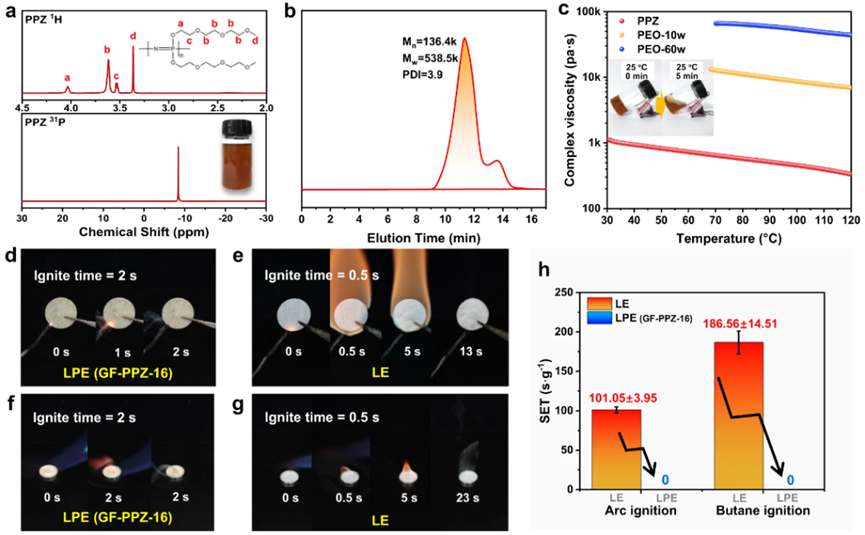 如图2所示,合成的高分子量PPZ具有明确的结构,在室温下流动性良好,将其与锂盐复合制备得到LPE,使用电弧点火枪和丁烷气喷枪均无法点燃LPE,其对应的自熄时间(SET)均为0。