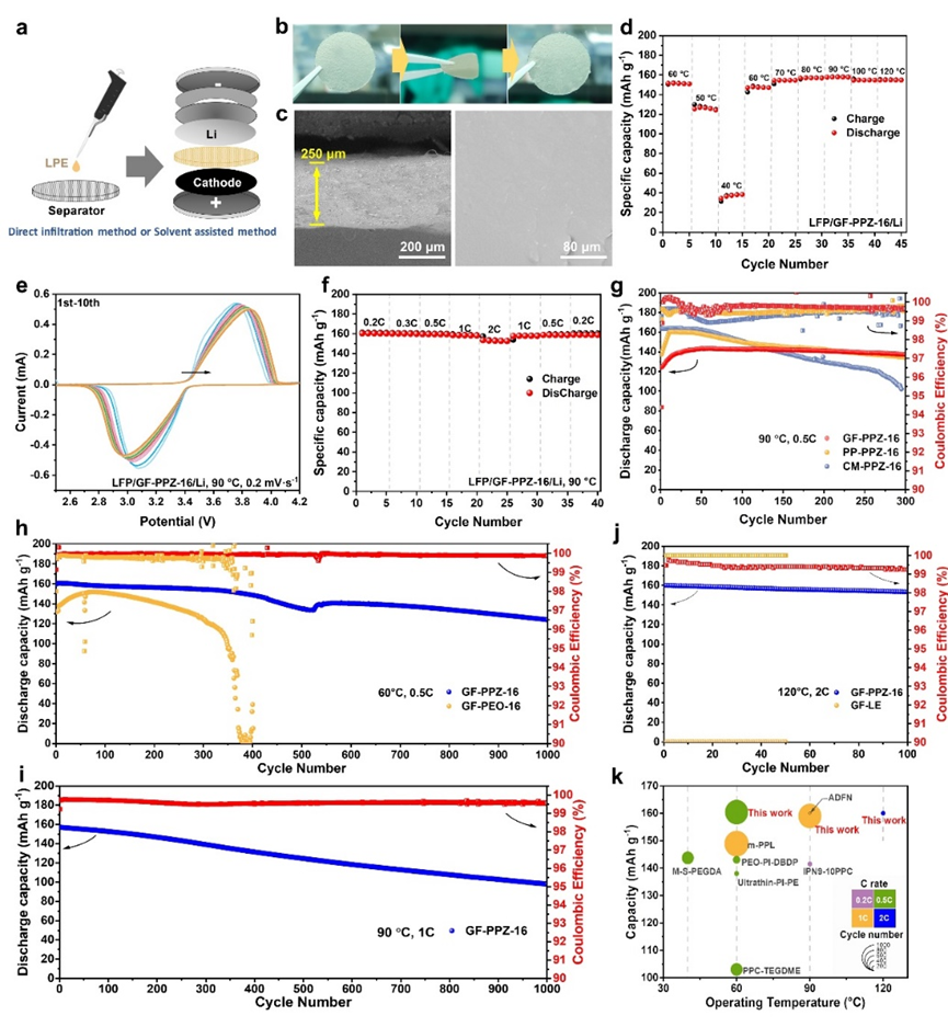LPE填充到多孔隔膜中能够得到稳定的三维结构,不发生宏观上的泄露。如图3所示,LPE基电池在0.5 C,50 ℃至120 ℃范围内都具有可观的容量;在60 ℃和90 ℃下,可稳定循环1000圈,平均库伦效率>99.5%;在2 C,120 ℃下可稳定循环100圈;综合锂电池的放电容量、循环倍率、循环次数、工作温度,LPE与已报道的聚合物电解质体系相比具有显著优势。