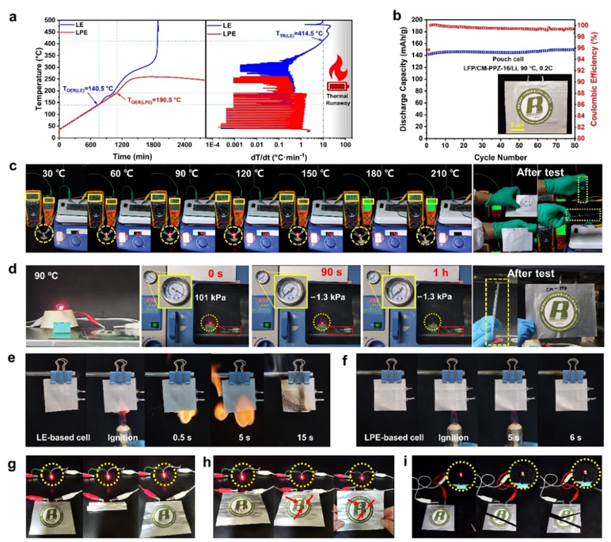 如图4所示,无溶剂的LPE能够显著抑制电池热失控;基于LPE的软包电池能够稳定循环80圈且容量没有衰减,库伦效率>99%;软包电池在高达210 ℃的高温下仍然能正常工作,且在真空下加热90 ℃也能正常使用;LPE赋予了软包电池阻燃性;此外,LPE基软包电池能抵抗穿刺、剪切等物理破坏。