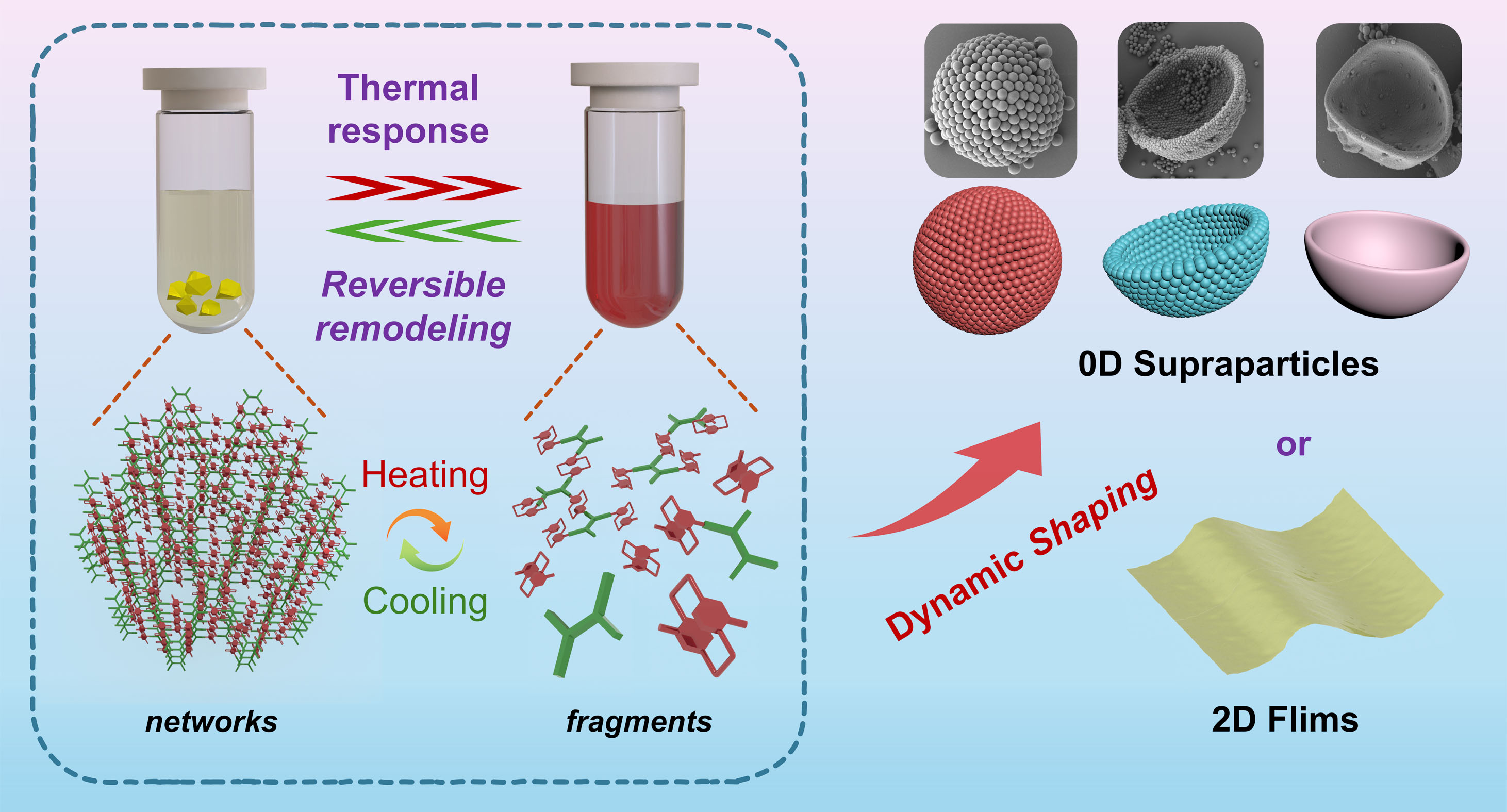 四川大学马利建课题组首次提出了一种基于可溶性共价有机网络(SCONs)的超结构热响应动态合成策略,该策略能够实现从0D空心超粒子到2D薄膜的形态调节,从而便捷地制备得到多维复杂超结构材料。机理研究表明,得益于构建单体(4,12-二甲酰基[2.2]对环芳烷)的独特双层结构,SCONs具有“裂解-重塑”的结构转换特性,可以通过温度控制实现从可逆溶解、重组到超结构构建的动态过程。具体实验中,通过液滴喷射技术获得油包水乳滴,即可在油-水界面原位高效制备出0D球形空心超粒子以及其他类碗状的复杂超结构。此外,通过调节外源溶剂的挥发性和溶解性,还可在气-液界面制备出无缺陷的2D薄膜材料。扩展实验进一步证实了所提出的动态“裂解-重塑”策略的普适性和可扩展性。对客体碘分子的富集研究发现,相比于单一层次结构的材料,超结构材料具有更加卓越的动力学传质性能,进一步证实了材料微观结构对其宏观功能性质的重要影响。