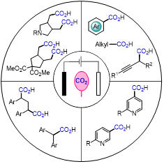 CO2不仅是人们熟知的温室气体,也是一种重要的碳一资源,具有储量丰富、廉价易得、可循环再生等优点。然而,由于其具有较高的热力学稳定性和动力学惰性,CO2活化和化学转化存在巨大挑战。电化学体系利用电子/空穴作为绿色还原剂/氧化剂,可高效实现对CO2或有机分子的活化,而且可以通过调节氧化还原电位实现高活性中间体的可控形成和转化,从而成为合成化学的重要手段。其中,CO2参与的电化学羧基化反应是合成羧酸这类高附加值化学品的绿色方法,也是实现CO2资源化利用的重要途径。余达刚教授团队一直致力于在温和条件下实现CO2的高效活化与选择性转化(综述:Sci. China Chem. 2020, 63, 1336; Acc. Chem. Res. 2021, 54, 2518; Natl. Sci. Open 2023, 2, 20220024; Sci. Bull. 2023, 68, 1225),自2017年起,针对CO2参与的电化学羧基化领域存在的关键问题开展了系统研究,取得了若干重要进展。该团队基于CO2插入碳-金属键、碳亲核试剂进攻CO2以及阴极还原CO2为自由基负离子等CO2活化模式,开发了高效的电化学体系,成功实现了四类CO2参与的电化学羧基化反应:(1)碳(类)卤键的(不对称)还原羧基化(Nat. Commun. 2021, 12, 7086; Chin. Chem. Lett. 2024, 35, 110104; J. Am. Chem. Soc. 2024, 146, 14864);(2)碳碳单键的还原羧基化(J. Am. Chem. Soc. 2022, 144, 2062; Sci. China Chem. 2024, DOI: 10.1007/s11426-024-2075-6);(3)非活化非共轭二烯中碳碳双键的还原双羧基化(Angew. Chem., Int. Ed. 2023, 62, e202301892);(4)氮杂芳烃区域选择性可调控的碳氢键羧基化(Nature 2023, 615, 67)。这些工作促进了CO2化学和有机电化学领域的发展,为CO2资源化利用提供了新的思路。