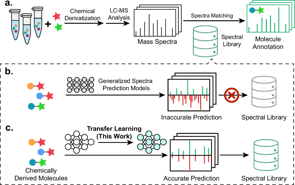 化学衍生化是质谱分析中的一种常用技术,被广泛应用于生物标志物发现、代谢组学及非靶向环境组研究中。但化学衍生化分子(CDMs)普遍缺少标准化的质谱谱图,难以实现高通量结构鉴定,是当前化学衍生组学亟待解决的瓶颈问题。