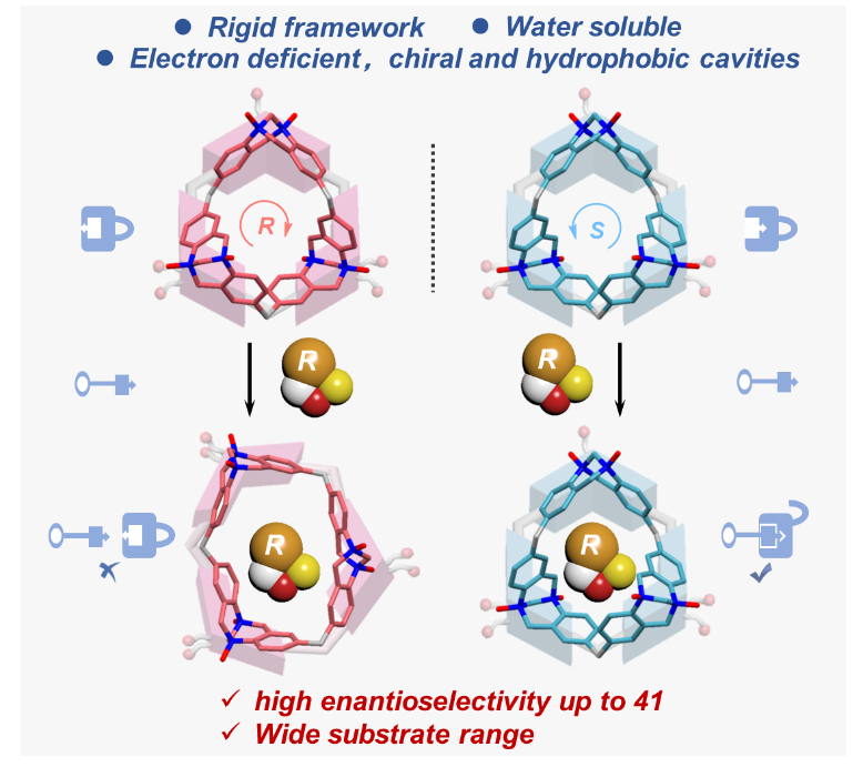 水环境中的手性识别对各种生物过程至关重要,并对药物的疗效和安全性等产生重大影响。利用合成受体了解和复现手性识别对于增强生物相互作用的了解以及促进手性分子的检测和分离至关重要。手性大环分子具有结构明确的手性空腔,展现出潜在的手性识别的能力。但当前大多数人工受体的手性识别表现为对映选择性较低,客体分子的选择范围有限。
