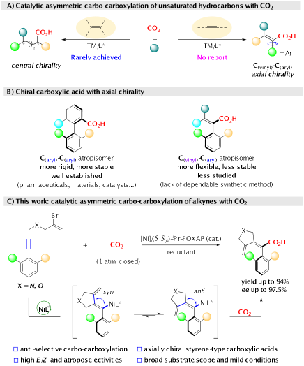 二氧化碳(CO2)作为一种储量丰富、廉价易得且无毒可循环再生的碳一资源,其高效利用对于推动绿色可持续发展具有重要意义。通过化学合成将CO2转化为高附加值的羧酸类化合物是实现CO2资源化利用的重要途径之一。轴手性羧酸类化合物作为一类重要的有机分子,不仅是天然产物和生物活性分子的重要母核结构,也可以作为不对称催化中的手性羧酸配体参与一系列催化转化。与发展较为成熟的联芳基轴手性羧酸化合物的不对称合成相比,苯乙烯型轴手性羧酸化合物由于结构灵活和构象稳定性相对较低,其不对称合成仍然是有机合成中的一个重大挑战。迄今为止,该类骨架的不对称催化合成方法较少,并且局限于底物中预先引入羧酸官能团。因此,开发一种新型高效的催化体系来实现CO2参与苯乙烯型轴手性羧酸的构建具有重要意义。