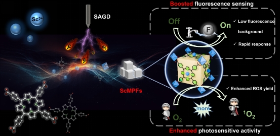 郑成斌/张金懿团队提出了一种溶液阳极辉光放电(SAGD)微等离子体,用于一步合成钪-金属卟啉框架(ScMPFs)。SAGD 技术具有操作简单、反应速度快、能耗低、温度低等优点。在等离子体-液体界面提供的大量电子不仅加速了MOFs的快速成核和生长,还促进了离子半径小、配位能力强的钪(Sc3+)掺入卟啉环中的N原子,提高了MOFs的金属化程度。此外,还可以通过调节反应时间和放电气体直接控制 ScMPF 的生长和金属化。较高的Sc3+金属化程度使 SAGD-ScMPFs 表现出优异的光生电子-空穴对分离能力、增强的 ROS 产率和荧光传感能力。随后,SAGD-ScMPFs 被用于灵敏检测水中的F-,并有效抑制了几种革兰氏细菌。这项研究提出了一种快速金属化卟啉 MOFs 的新策略,为合成更广泛的多功能金属卟啉框架提供了重要支撑。