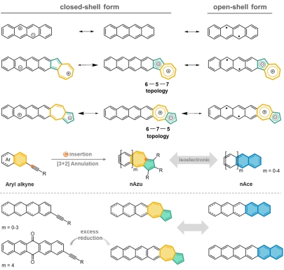 近日,张程课题组与游劲松教授、西班牙马拉加大学Juan Casado教授合作,利用游劲松团队报道的骨架编辑[3+2]环化策略,自下而上构筑了系列具有6-7-5拓扑结构的薁嵌并苯分子nAzu (2Azu-6Azu)。由于富电并苯结构与薁的缺电七元环直接稠合,正电荷在富电并苯体系上离域,nAzu分子以闭壳形式存在,具有更小的双自由基特性,5Azu和6Azu比并五苯和并六苯更加稳定。薁和并苯的协同作用还使nAzu分子表现出扩展到近红外区的长波吸收特征、可逆酸化特性以及多重反Kasha发光特性,丰富了并苯的光电性质的同时还保留了其半导体电荷传输的特性。