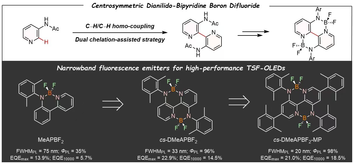 游劲松教授/宾正杨教授团队揭示了中心对称构型在构筑氟硼类窄光谱发光材料中的重要意义。作者开发了一种新型中心对称的二苯胺基联吡啶硼二氟化物,命名为cs-DAPBF2。理论计算表明cs-DAPBF2在激发态和基态之间的结构弛豫显著减少,不仅减小了斯托克斯位移,还提高了辐射跃迁速率,为实现窄光谱和高效率的发光材料提供了新的分子设计思路。为高效构筑此类分子,作者发展了一种双螯合辅助的C–H/C–H自偶联策略构筑3,3'-氨基-2,2'-联吡啶中间体。通过进一步的分子设计,成功合成了窄光谱绿色发光分子cs-DMeAPBF2-MP,基于该发光分子成功制备了高性能的窄光谱绿光超敏荧光OLED器件,其展现出高效率和极小的效率滚降。这项工作突显了中心对称结构在开发窄光谱发光分子方面的重要意义,也同时展现了C–H/C–H自偶联反应在开发一些结构对称的OLED新材料方面的巨大应用价值。
