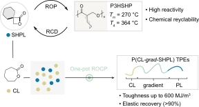 针对上述问题,本文设计了一种新型α-螺环-环己基丙内酯 (α-spiro-cyclohexyl-propiolactone, SHPL),其在催化剂负载量低于1 ppm时仍展现出高开环聚合反应活性。由此得到的聚-3-羟基-2-环己基丙酸酯(P3HSHP)具有很高的热稳定性以及熔融转变温度,其 Td, 5% = 364 ℃,Tm = 272 ℃。进一步,将SHPL与ε-己内酯(CL)进行直接共聚,用于制备高强高韧热塑性弹性体。所合成的梯度共聚物P(CL2000-grad-SHPL500),展现出58.8 ± 4.03 MPa的极限拉伸强度、1959 ± 53%的断裂伸长率、创纪录的600 MJ/m3的韧性以及高于90%的弹性恢复率(图1)。SHPL的这些优异性能为新型、可持续高性能热塑性弹性体的开发提供了有力支撑。