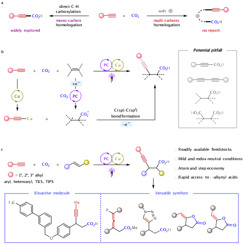 二氧化碳(CO2)是一种储量丰富、廉价易得、无毒且可再生的碳一资源,将CO2转化为高附加值化学品具有重要的应用前景,受到合成化学家们的广泛关注。羧酸化合物不仅广泛存在于各种生物活性分子中,也是有机合成中重要的合成砌块,利用CO2参与羧基化反应是合成羧酸化合物的重要方法。其中,末端炔烃与CO2的直接C(sp)−H键羧基化反应被广泛研究,是炔烃的重要同系化增碳反应,可快速高效地构建高附加值的丙炔酸化合物。同时,非共轭炔基羧酸也是一类具有重要应用价值的化合物,然而利用CO2参与的炔烃多碳同系化来构建重要的非共轭炔基羧酸目前仍未被实现。由于端炔与CO2易发生直接C(sp)−H键羧基化反应,高效高选择性地实现三组分炔烃多碳同系化反应存在巨大挑战。因此,发展一种新的催化策略来实现该类转化具有重要意义。