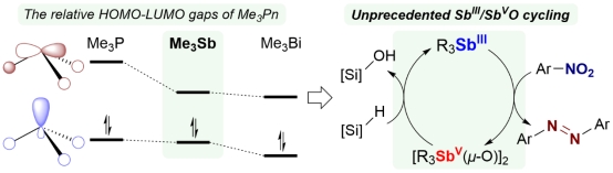 近年来,四川大学周吉亮课题组聚焦于主族金属锑(Sb)的变价催化研究,已经报道了以低价有机锑化合物为催化剂的SbI/SbIII变价催化体系的开发与应用(J. Am. Chem. Soc. 2024, 146, 20432)。最近,他们通过理论研究发现,Me3Sb在其同系物中具有最小的HOMO-LUMO能隙,表明了其最强的双亲性,这赋予其良好的反应活性。Me3Sb可以还原硝基芳烃生成氧化偶氮芳烃和偶氮芳烃,自身被氧化。而锑氧化物可以被硅烷还原再生Me3Sb。基于此,该工作实现了Me3Sb催化的硝基芳烃的还原反应,代表了首例SbIII/SbVO催化体系的构建。另外,其它三烷基锑化合物也能够催化硝基芳烃的还原反应。其中,三丁基锑表现出良好的催化活性,能够以中等到优秀的产率将硝基芳烃转化为偶氮芳烃或氧化偶氮芳烃,反应表现出对硝基还原良好的选择性。这展现了SbIII/SbVO催化体系在有机合成中的应用潜力。