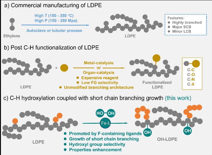 该工作以“Iron (III)-Catalyzed C-H Hydroxylation of Low-Density Polyethylene Coupled With Short Chain Branching Growth”为题发表在《Angewandte Chemie International Edition》上。文章第一作者为体育网足球即时比分-球琛足球即时比分