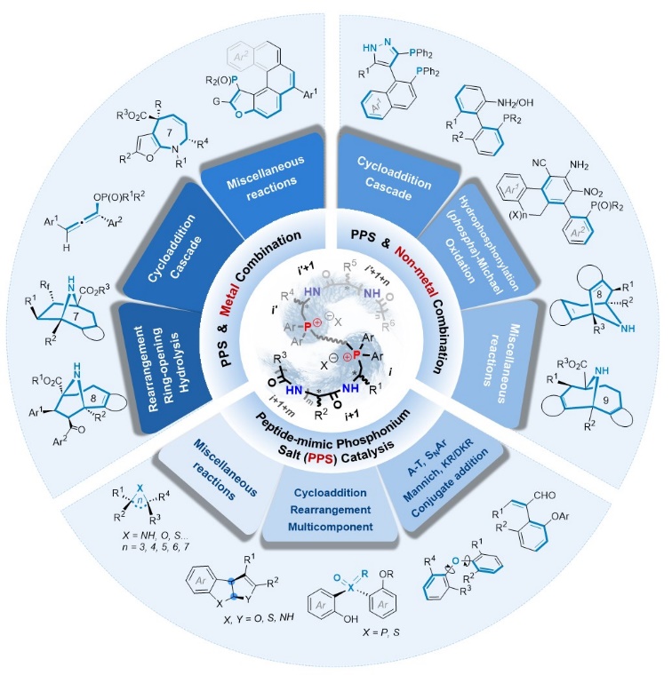 王天利教授团队应邀在Accounts of Chemical Research杂志上发表了题为Bioinspired Chiral Peptide–Phosphonium Salt Catalysis: From Enzymes to Cationic Small-Molecule Enzyme Mimics的研究总结,系统总结了仿生手性肽季鏻盐催化体系的系列特色的原创性研究成果。