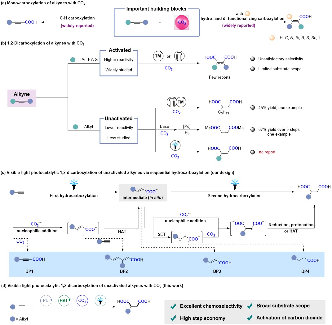二氧化碳(CO2)作为一种无毒、廉价且可再生的理想C1合成子,其催化转化制备高附加值羧酸,具有重要应用价值,也存在反应活性低和选择性难调控等困难。另一方面,炔烃是一类来源广泛且容易获得的有机化合物,利用其参与羧基化反应可高效合成多种重要羧酸产物。目前,CO2参与炔烃C(sp)-H键和π键断裂的单羧基化反应已经被广泛报道。相比而言,CO2参与炔烃的1,2-双羧基化反应研究较少,底物主要局限于活化的芳基炔烃。而非活化的烷基炔烃由于反应性较低,其1,2-双羧基化转化面临巨大挑战,目前仅有零星的报道,且普遍存在反应效率低、底物范围窄等局限。因此,开发新策略实现CO2参与非活化炔烃的1,2-双羧基化反应,具有重要意义。