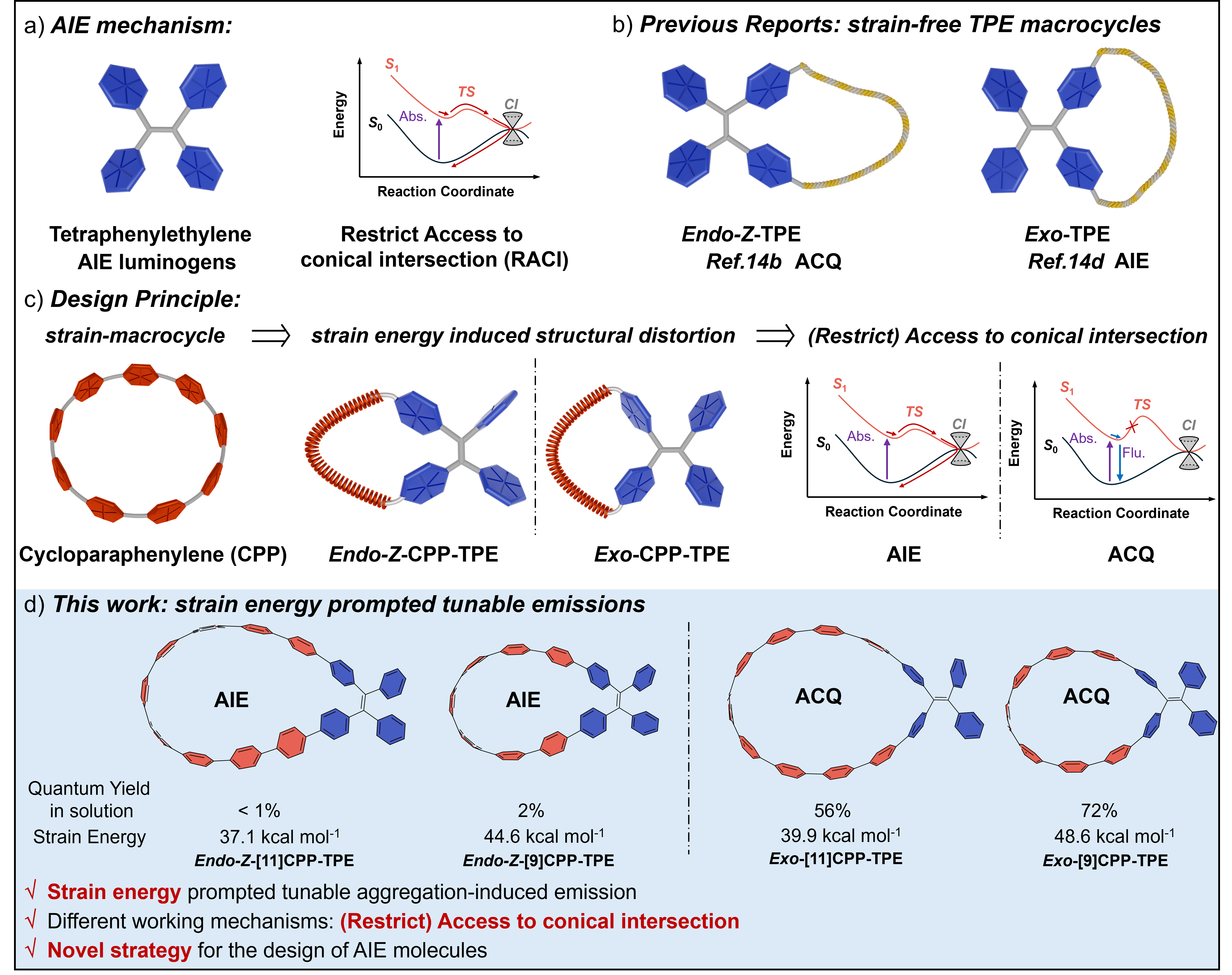 近期,成楚旸教授团队和苏志珊教授/胡常伟教授团队合作,将环对苯撑的张力与聚集诱导发光(AIE)效应中的代表性分子四苯乙烯进行策略性耦合,从不同方向对四苯乙烯施加张力,调控其在激发态通过锥形交叉点的路径能垒,从而调节其发光行为。