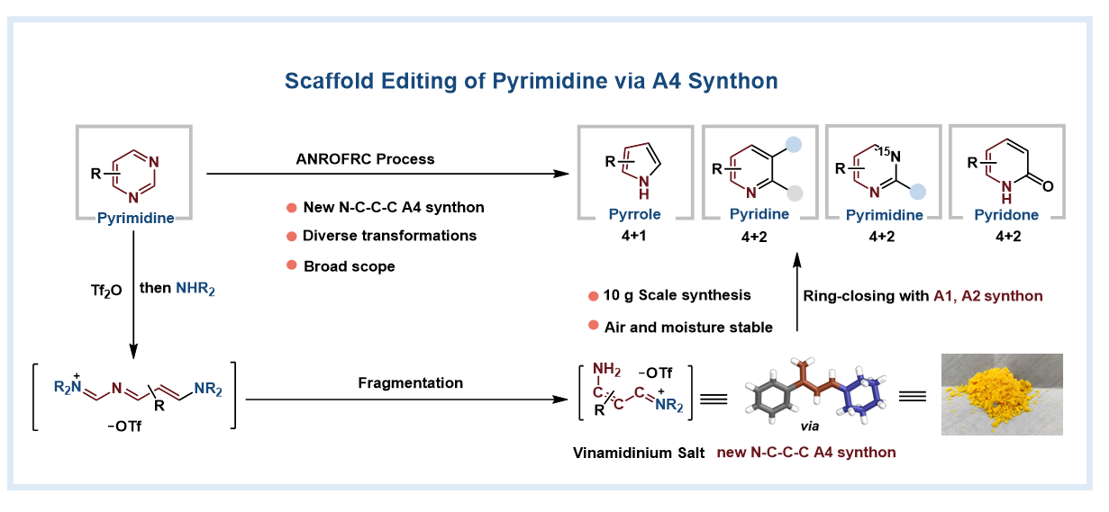 付海燕/薛卫超团队开发出一种创新的嘧啶骨架编辑策略,通过亲电驱动的ANROFRC(亲核加成-开环-裂解-关环)过程,成功将4-芳基嘧啶转化为结构多样的氮杂芳烃。该策略的关键在于原位生成稳定的Vinamidinium盐中间体,其作为独特的N-C-C-C四原子合成子,可与多种A1/A2合成子发生环化反应,高效构建吡咯、吡啶及15N标记嘧啶等杂环体系。该方法底物适用性广、官能团兼容性好,实现了从单一前体到多类氮杂环的多样性编辑,为药物分子后期修饰及先导化合物优化提供了强大工具。