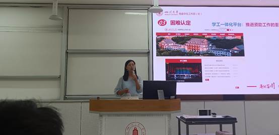 首先,王丽梅老师对同学们到来到四川大学表示了热烈的欢迎,分享了自己的求学和工作经历。重点介绍了学校的相关资助政策,以及申请条件和流程,鼓励同学们遇到困难及时向学院和学校报告以获取帮扶,渡过难关顺利完成学业。