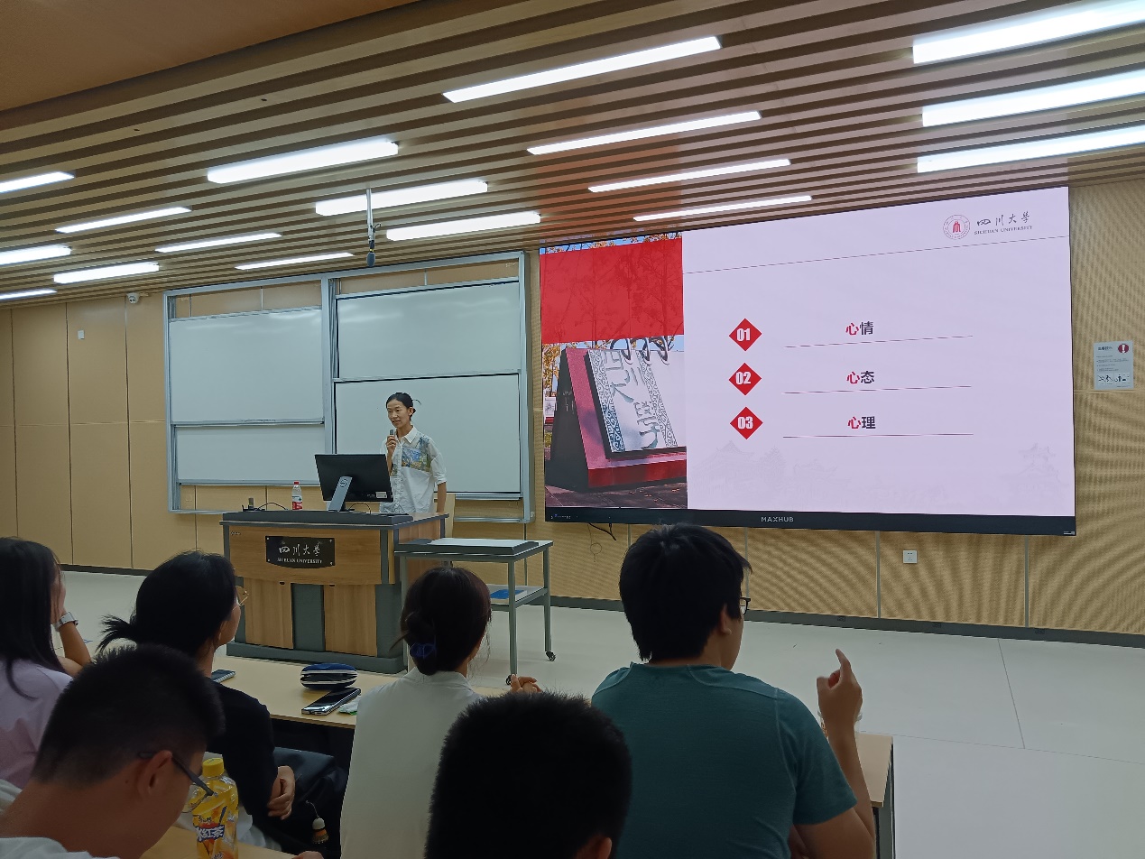 首先,王瑾一老师以一条包含大学生生活中可能会遇到的相关问题的小视频开始,询问了同学们对四川大学的第一印象,与同学们进行了亲切的交流互动;然后提出了学生应当注重心情,心态,心理方面的诸多内容,与同学们就初入川大的心情做了交流。