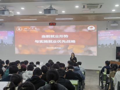 党委书记谢均老师于2025年3月28日晚在望江校区基础教学楼C204教室为同学们带来题为“当前就业形势与实施就业优先战略”的专题讲座。