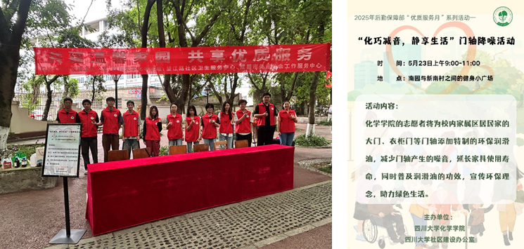 2021级本科学生党支部联合四川大学社区建设办公室,在望江校区校内家属区举办“化巧减音,静享生活”门轴降噪志愿活动。本次活动由支部书记张美成老师带领,党支部十余名同学参与活动。