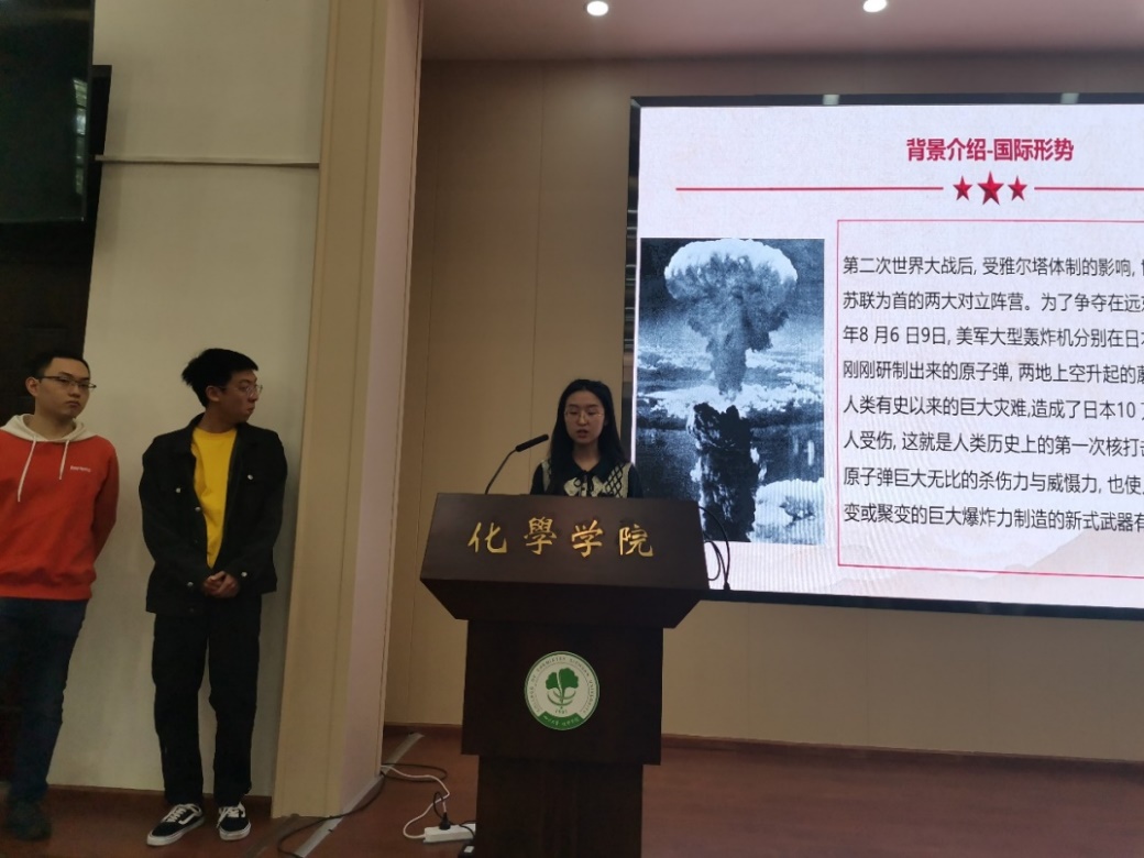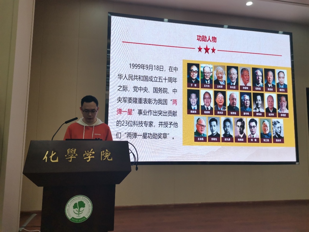 宣讲分为七组进行,陈亮组详细介绍了两弹一星的相关史料,两弹一星是新中国成立不久后面对美国核威胁的背景下党领导的科技攻关项目,在党的领导下全国人民齐心协力、科学家舍生报国终于打破了外国的核垄断,实现了原子弹氢弹的成功研制,保卫了祖国和人民。随后该组深入解读了两弹一星精神,并号召全体党员同志在以后的科研工作中要发扬这种科技报国的精神。