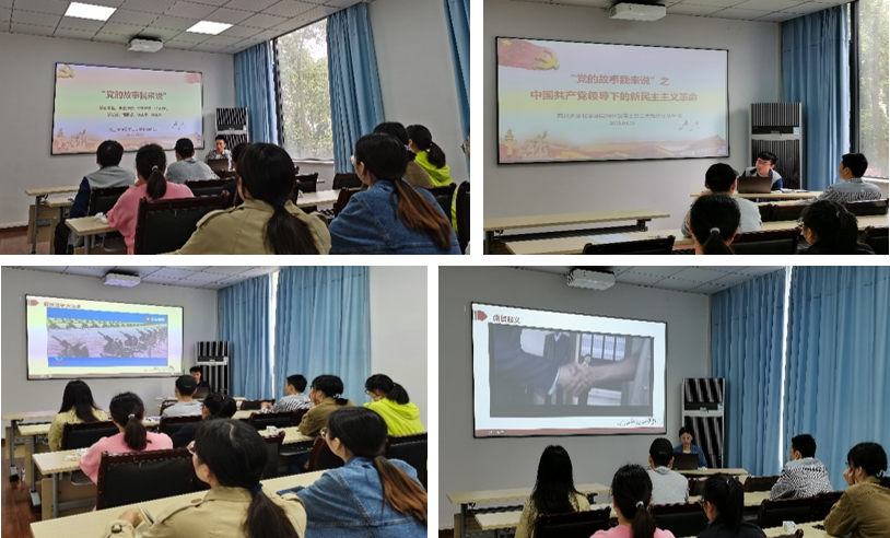 接着,开展了“党的故事我来说”系列学习的第一次活动,第一学习小组做了题为《中国共产党领导下的新民主主义革命》的专题讲演。小组成员着眼于建党到建国期间历史,分别介绍了我党经历的北伐战争、南昌起义、红军长征、西安事变、抗日战争、解放战争等重大历史事件,并重点介绍了欧百川、陈树湘、蔡炳义等几位英雄人物。经过第一小组的讲述,同学们重新认识了这一历史时期,并深入了解了几位历史中默默奉献和牺牲的英雄人物和他们创造的伟大事迹。