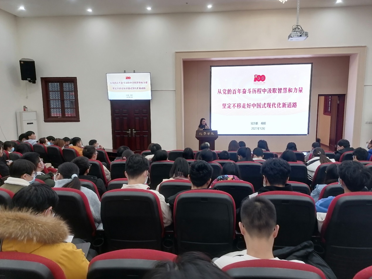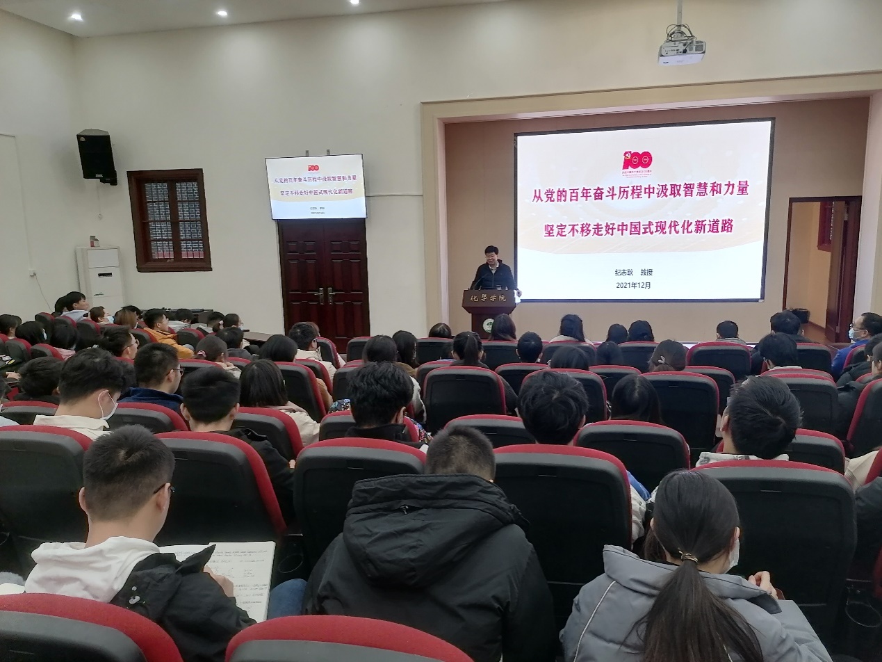 学习党的十九届六中全会精神宣讲会在化学馆321报告厅举行。学院邀请到四川大学“党的十九届六中全会”宣讲团专家、四川大学宣传部副部长纪志耿教授做专题宣讲。学院党政班子成员、党委委员、纪委委员、各支部书记及委员、部分教职工和学生等160余人参加了此次宣讲报告会。宣讲会由学院党委书记谢均主持。
