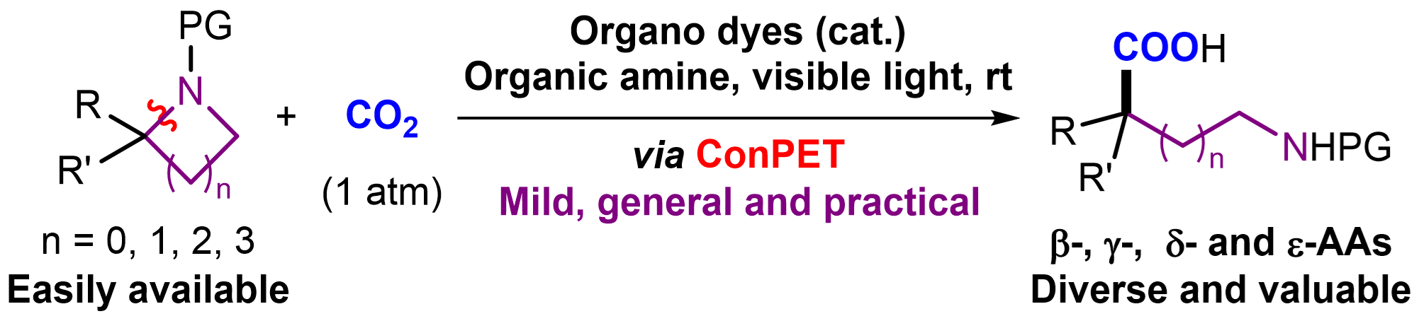32. L. Chen, Q. Qu, C.-K. Ran, W. Wang, W. Zhang, Y. He, L.-L. Liao, J.-H. Ye*, D.-G. Yu*, Photocatalytic Carboxylation of C−N Bonds in Cyclic Amines with CO2 by Consecutive Visible-Light-Induced Electron Transfer. Angew. Chem. Int. Ed. 2023, 62, 202217918. (Highlighted by Synfacts 2023, 19, 0527)